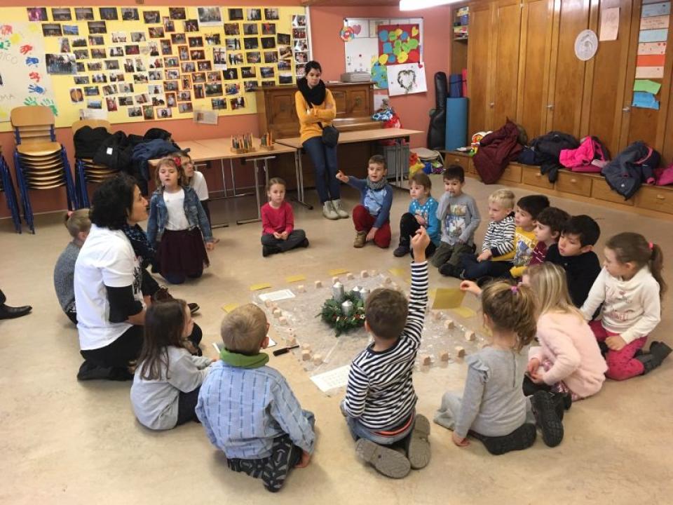 Passend zu diesem Auftrag haben die vielen Vertiefungsgruppen in unterschiedlichen Altersstufen einen Adventswürfel beklebt mit lauter guten Dingen, die sie in der Adventszeit tun möchten. Darunter symbolisierte der Staubsauger das Helfen im Haushalt, die Kerze das Denken und Beten für einen Menschen, der Smiley das Aufheitern einer Person und das gestrichene Handy der Verzicht auf Elektronik usw. Die Kinder hatten dabei grossen Spass, ehrlich mit sich selbst zu sein und sich auszusuchen, was sie bereit sind, in der Adventszeit an Gutem zu tun, um sich auf das Jesuskund vorzubereiten.